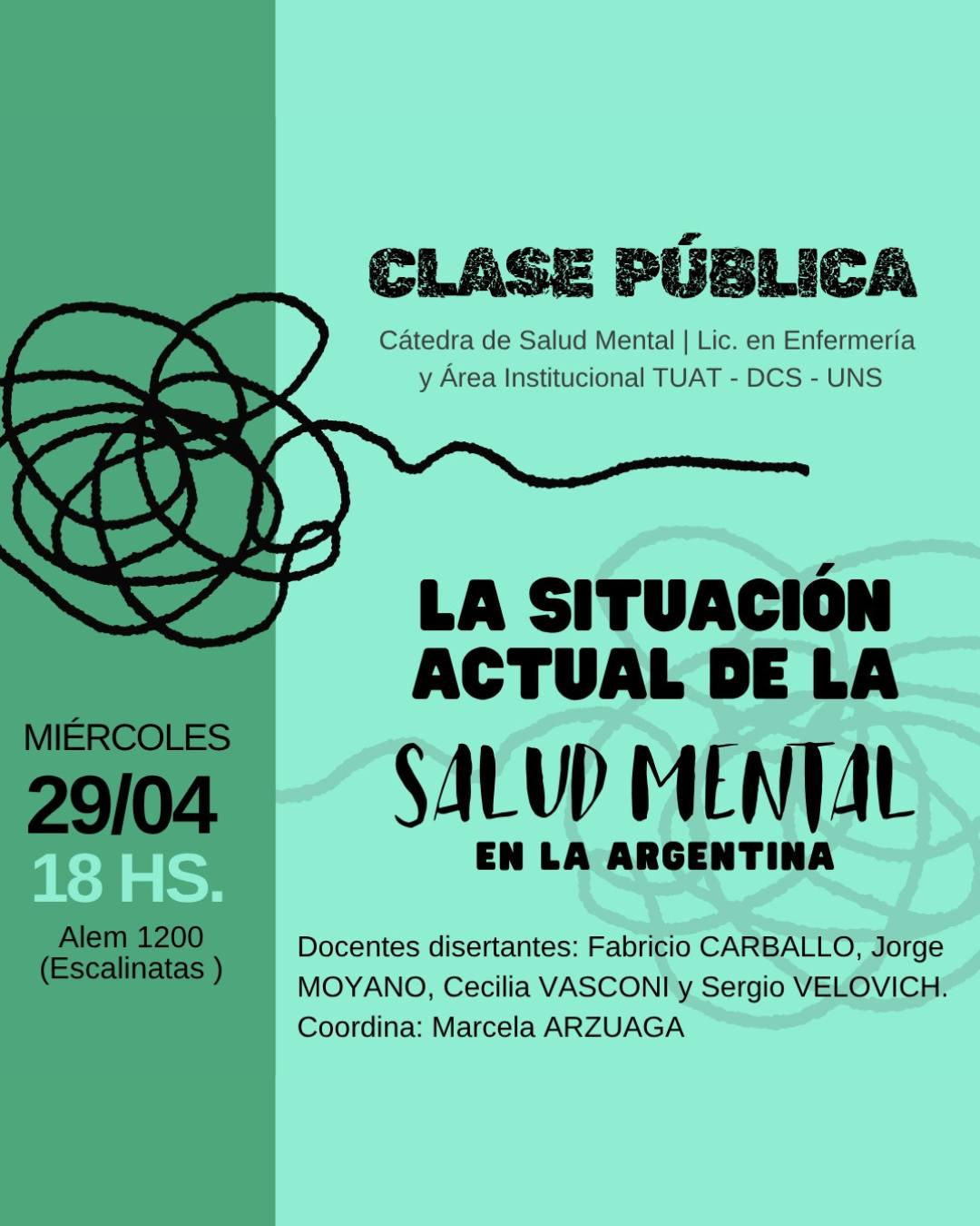 Este miércoles 29 de abril a las 18, en las escalinatas de la Universidad Nacional del Sur (Alem al 1200), se va a hacer una clase pública sobre la situación actual de la salud mental en la Argentina.