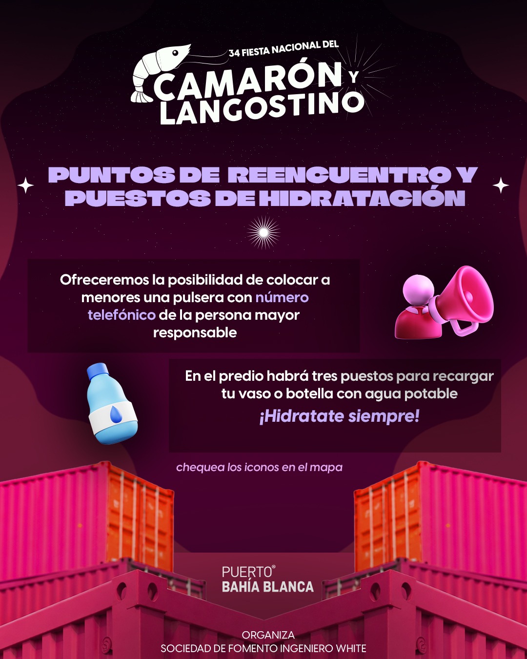 Recomendamos tomar agua durante toda la jornada en los puestos de hidratación gratuitos que encontrarás en todo el predio. Habrá dos en el sector del escenario Camarón y uno en el sector del escenario Langostino.