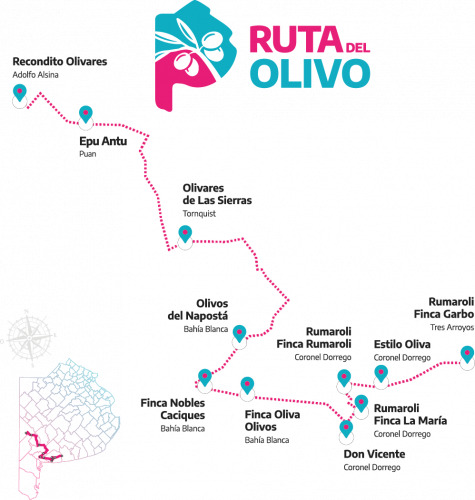 La olivicultura de la provincia de Buenos Aires se concentra en un 90% en la zona de Coronel Dorrego y los alrededores de Bahía Blanca, contó Honore. Algunos de estos establecimientos, como el propio Epu Antu, son incluidos en la Ruta del Olivo, un circuito productivo impulsado por el Ministerio de Desarrollo Agrario provincial.